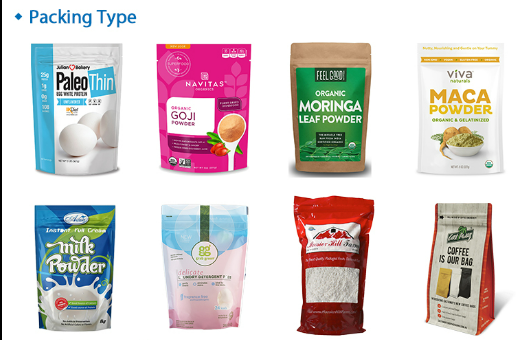 - 파우치 타입 :스파우트 백, 지퍼 백, 베개 백, 3 개의 사이드 백, 4 개의 사이드 백