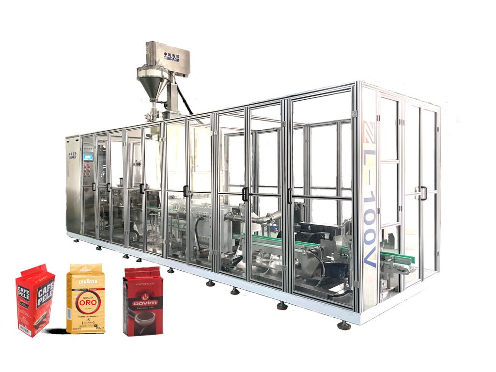 롤러 필름으로 백을 형성하는 VFFS 포장기 - 저울 무게 측정 및 제품 채우기 .- 제품으로 백 채우기 백 운반 모듈로 떨어짐 - 백 상단 성형 및 청소 - 백 거싯 폴딩 -- 백 사전 밀봉 및 진동 -- 백을 다음으로 보내기 진공 챔버 ---Vacuuming 및 최종 밀봉 --완성된 백 출력 및 백 상단 트리밍 ---완성된 백 출력