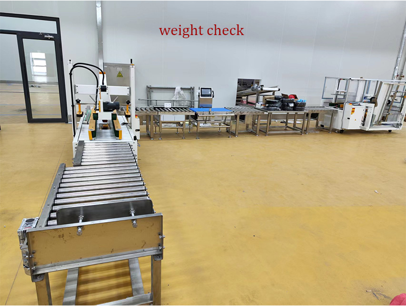 봉지에 냉동식품을 채운 후 각 봉지마다 중량 감지기로 재점검하여 중량이 목표 중량과 일치하는지 확인한 후 금속 탐지기를 통과하여 각 봉지에 금속이 혼입되지 않았는지 확인합니다. 그런 다음 백은 카톤 충전 라인으로 이송됩니다.