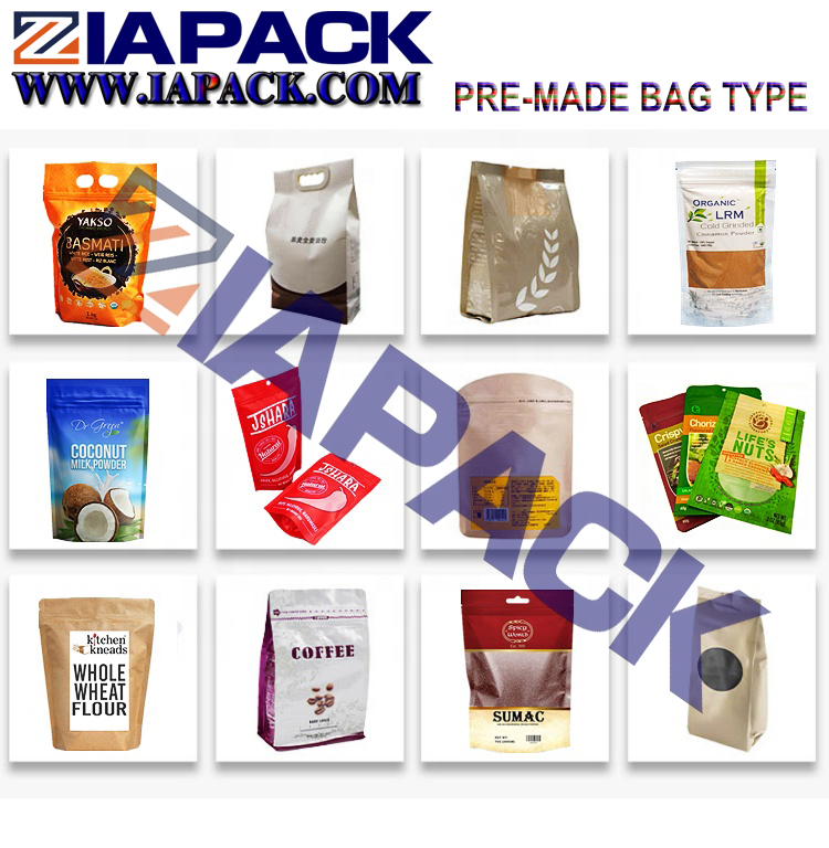 씨앗, 사료, 콩, 설탕, 팝콘, 칩, 견과류, 애완 동물 사료, 차 및 금속 또는 플라스틱 부품, 자동 재료 공급 장치, 계량 봉인 기능 등을위한 사전 파우치 용 계량 필 봉입 솔루션에 대한 널리 적용